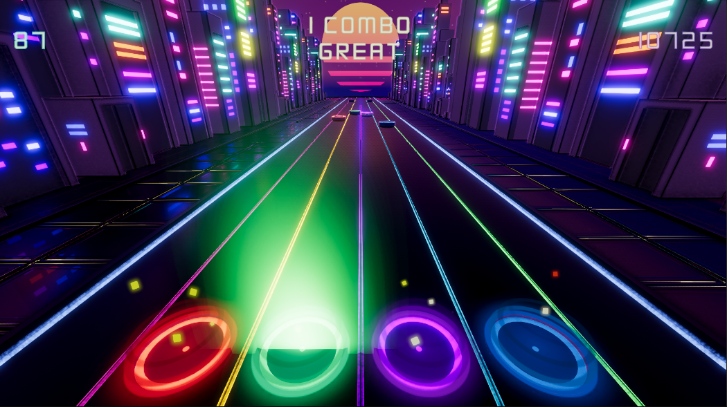 Este juego de ritmo con estética neón te sumerge en niveles diseñados al compás de música emblemática de videojuegos, fusionando gameplay fluido, retrofuturismo visual y feedback dinámico.
